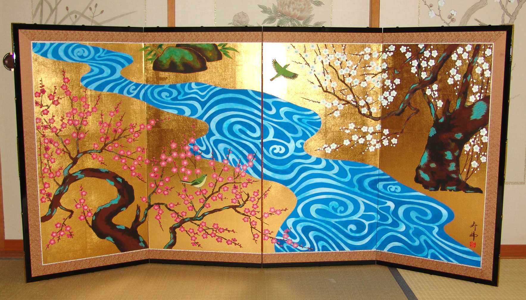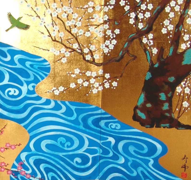 NO. X-154 “Plum tree and Water”on gold Paper by Master Juho Tominaga